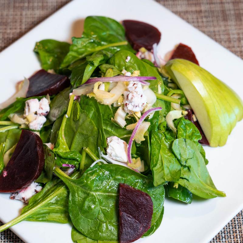 Baby spinach leaves, sliced red beets, Belgian endive, granny smith apples, cranberry goat cheese, red onions in a balsamic vinaigrette dressing.